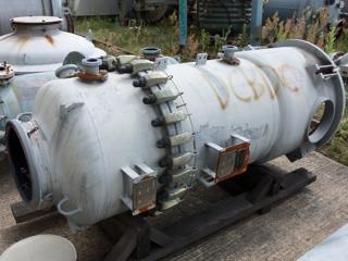 system includes: (1) 40 square meter 316L (1.4404) stainless steel tube, head and shell vertical heat exchanger, CE0036, manufactured by Sulzer, type NK 40m2, max allowable pressure tube side -1/6 bar @ -10/200 degrees C (265 liter), shell -1/3 bar @ -10/200 degrees C (550 liter), (192) 25.4mm OD x 2.5m long 316L (1.4404) stainless steel tubes, multi-pass tube side, 638mm diameter 316L (1.4404) stainless steel shell, 3062mm overall length, (2) 316L (1.4404) stainless steel flat heads