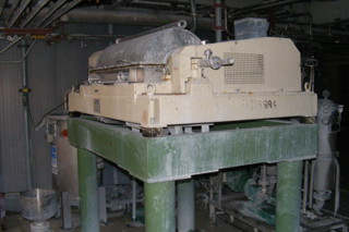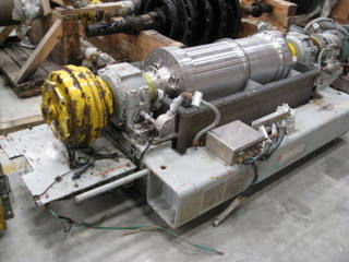 decanter Contour bowl design 3 phase seperation With ajustable weirs Average flow rate for feed is 35 gpm Originally built with a 110 mm pitch Main motor : CE rated 50 CYC, 400 volt, 60 cycle 460 volt Back drive: 4 KW 3/50/380 volt motor, 1440 rpm.